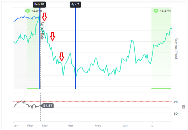 But as you can see from the Trade Cycles Annual Pattern chart above, a period of seasonal weakness for IWM began last Wednesday, February 18 and this potential downtrend extends through April 7.