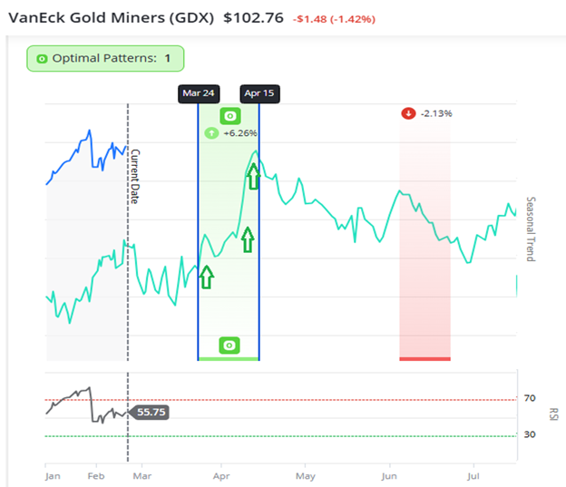 According to the Trade Cycles chart above, the VanEck Gold Miners ETF (GDX) has a few weeks of seasonal weakness ahead.