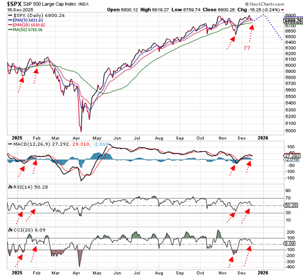 Similarly, the recent November decline created a bearish cross in the moving averages. While the market has since recovered, it’s possible that decline was a warning sign of trouble to come. If so, the stock market could be setting up a difficult start to 2026.
