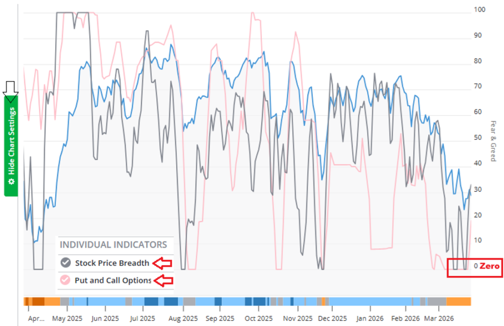 - Put and Call Options compares the volume of bearish puts vs. bullish calls. When the ratio gets lopsided like this (zero) it means more puts traded, which signals extreme fear typical of a market low.