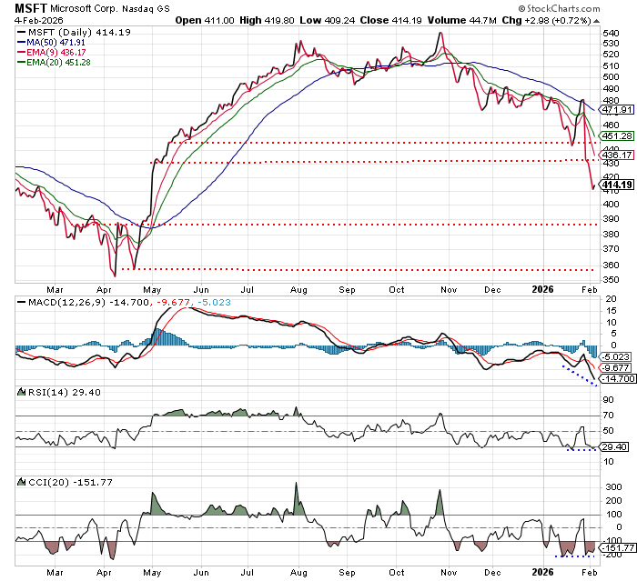 And you can see the various moving average lines are starting to expand pretty far away from each other. Now, Microsoft itself, at $414 a share, is trading quite significantly below its 50-day moving average, which is up here around $472, and it’s broken a couple of support levels.