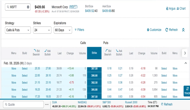 If I’m looking at maybe selling an uncovered put at the $390 strike price, I go down here and I look, I see the February 6 contracts. These are the ones that expire on Friday, February 6th, which I’m recording this on Wednesday, but you’re going to see this on Friday morning. They’re only trading for 25 cents. I’m not going to get much of a benefit to sell those uncovered puts. But if I go down a little bit and I go out maybe to next week, let’s go to the 13th and see what happens.