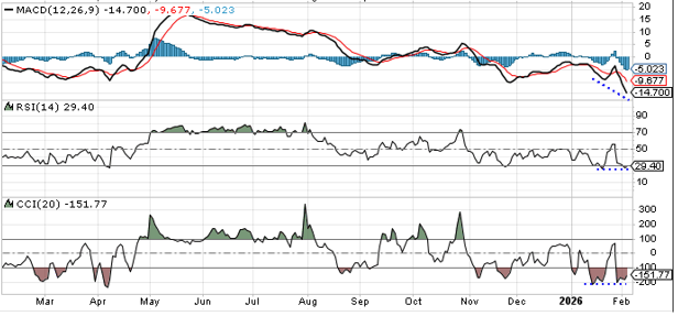 And I say that because if you look down at the momentum indicators at the bottom here, the MACD indicator, the RSI, that’s the Relative Strength Index for a 14-day period, and you’ve got the CCI, all three of them are making lower lows right along with the stock.
