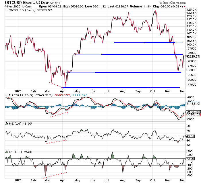 The last time we looked at the King of Cryptocurrencies it had broken a support level at $94,000 and we figured it was headed to $84,000. At that point, though, it would be oversold enough to justify a bounce. But, it wouldn’t be set up for a sustainable rally.