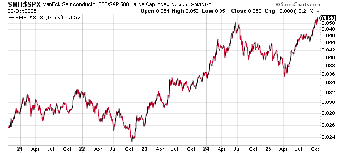 Look at this ratio chart comparing the performance of the semiconductor sector ETF (SMH) to the S&P 500…