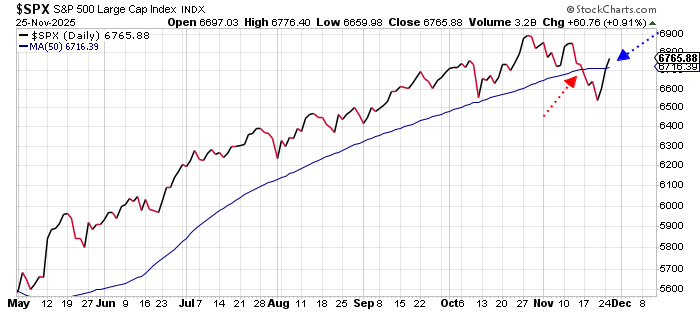 If the index can press higher and close above the mid-November high at about 6850, then no problem. The current bounce will likely continue, and there’s a good chance we’ll see new highs by the end of the year.
