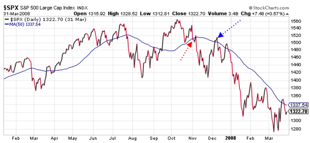 Most notable, though, is the index crossed below its 50-day moving average line in early November, sold off hard, and then rallied back to test the line as resistance in early December. Resistance held, and the S&P turned lower. It then went on to lose 15% in the early weeks of 2008.