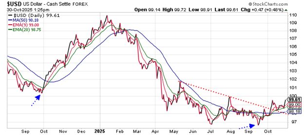 The US Dollar Index hit bottom last month right before the Fed lowered its target for short-term interest rates. Since then, the dollar has pressed steadily higher – making a series of higher highs and higher lows.