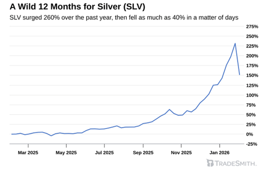 Over the past 12 months, the iShares Silver Trust ETF (SLV) rocketed as much as 260% before plunging 35% at the end of last month.