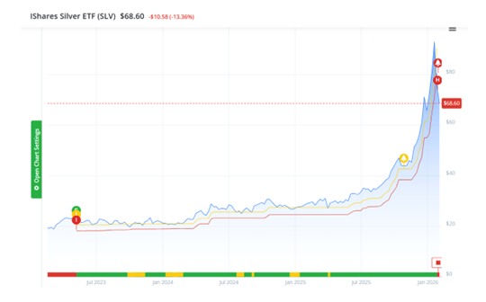 If you’d relied on this traffic-light approach – rather than trying to handicap interest rates, Fed politics, or the latest macro headline – you’d have captured a 243% gain in SLV in just under three years.