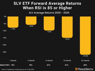 TradeSmith analyst Lucas Downy, editor of AlphaSignals, recently noted an extreme relative strength index (RSI) reading for the iShares Silver ETF (SLV). That’s an extreme, which historically has indicated trouble ahead.