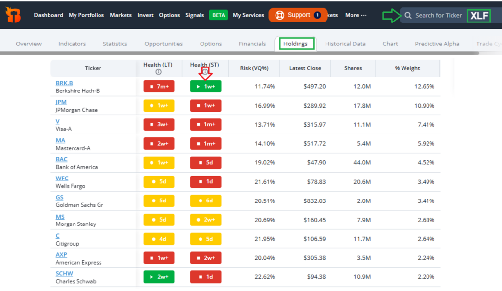 Type the symbol XLF in the Search for Ticker box, as shown above, then click on holdings to view the individual stocks that make up XLF.