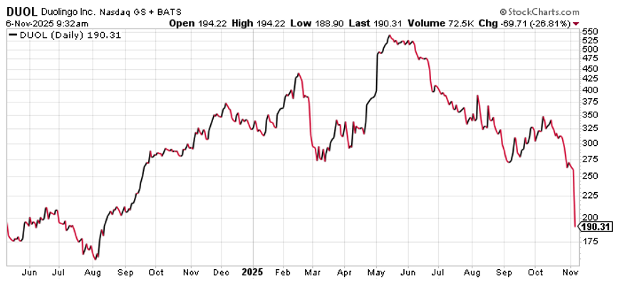 From mid-2024 to mid-2025, DUOL was one of the best-performing stocks in the market. The stock rallied from $180 per share to over $530 per share – a gain of nearly 200% – in less than a year.